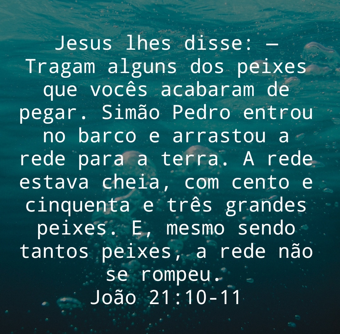 Jesus lhes disse: — Tragam alguns dos peixes que vocês acabaram de pegar. Simão Pedro entrou no barco e arrastou a rede para a terra. A rede estava cheia, com cento e cinquenta e três grandes peixes. E, mesmo sendo tantos peixes, a rede não se rompeu.