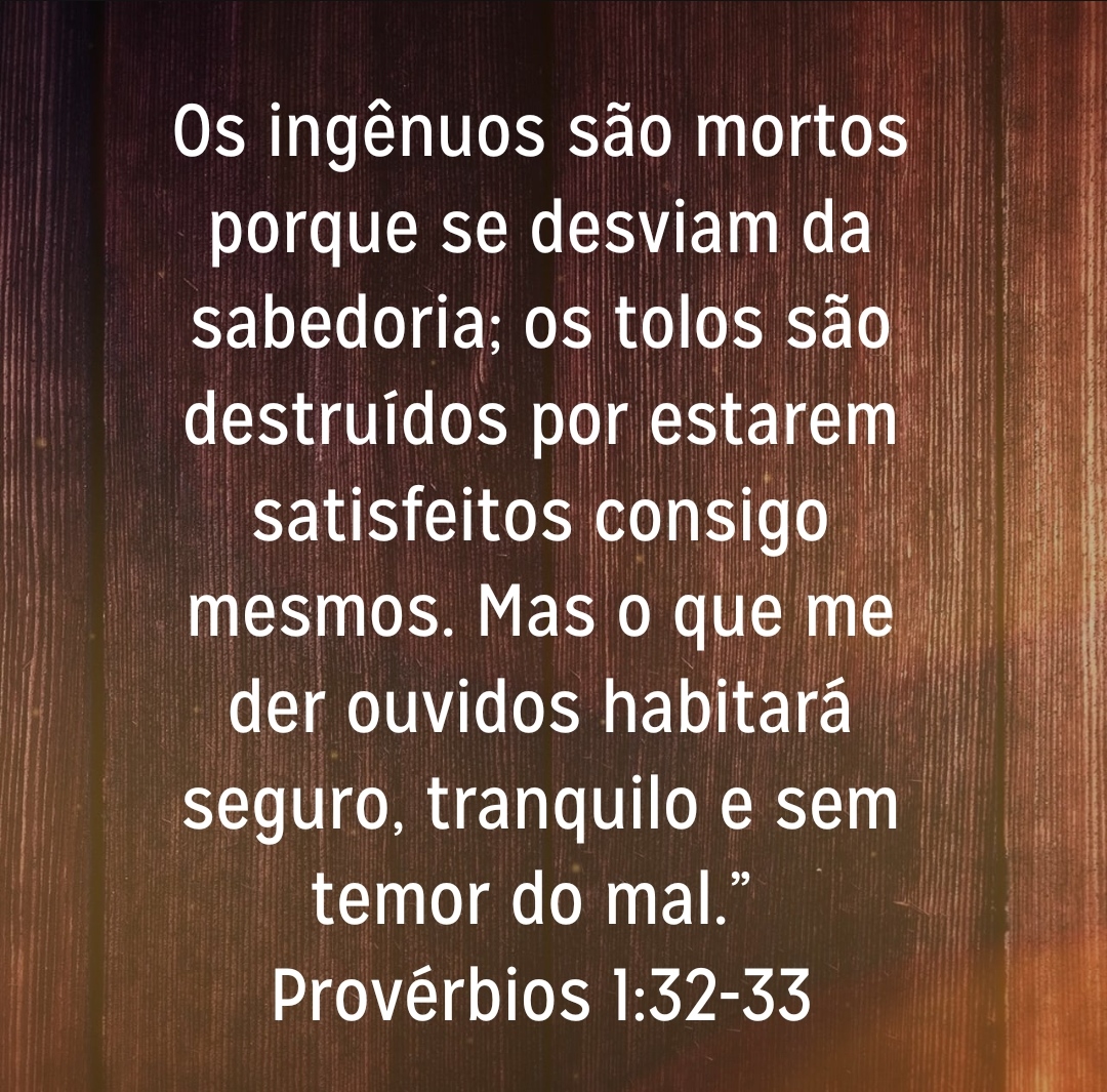 Os ingênuos são mortos porque se desviam da sabedoria; os tolos são destruídos por estarem satisfeitos consigo mesmos. Mas o que me der ouvidos habitará seguro, tranquilo e sem temor do mal.”