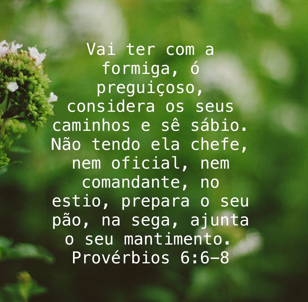 Vai ter com a formiga, ó preguiçoso, considera os seus caminhos e sê sábio. Não tendo ela chefe, nem oficial, nem comandante, no estio, prepara o seu pão, na sega, ajunta o seu mantimento.