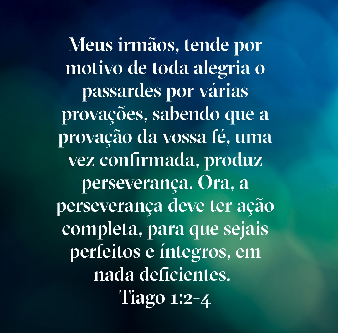 Meus irmãos, tende por motivo de toda alegria o passardes por várias provações, sabendo que a provação da vossa fé, uma vez confirmada, produz perseverança. Ora, a perseverança deve ter ação completa, para que sejais perfeitos e íntegros, em nada deficientes.
