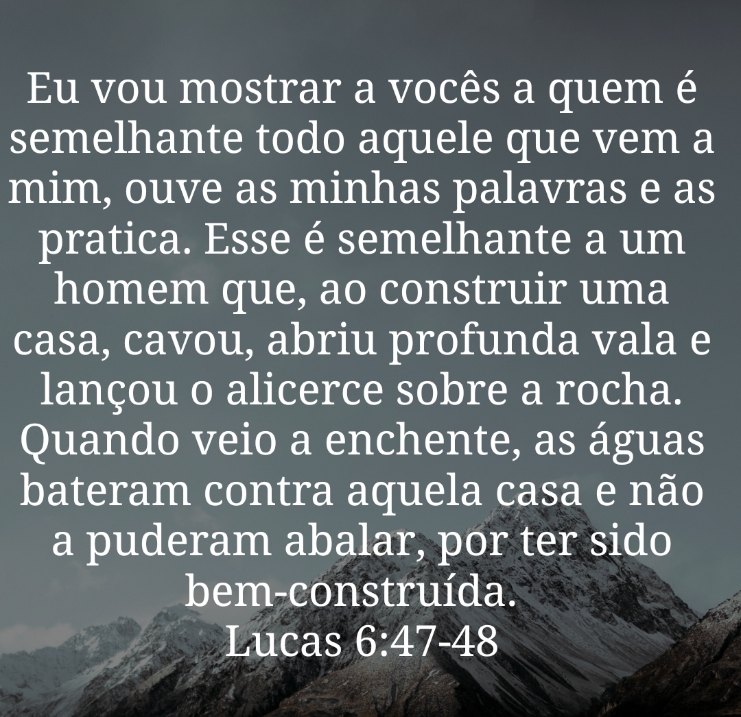 Eu vou mostrar a vocês a quem é semelhante todo aquele que vem a mim, ouve as minhas palavras e as pratica. Esse é semelhante a um homem que, ao construir uma casa, cavou, abriu profunda vala e lançou o alicerce sobre a rocha. Quando veio a enchente, as águas bateram contra aquela casa e não a puderam abalar, por ter sido bem-construída.