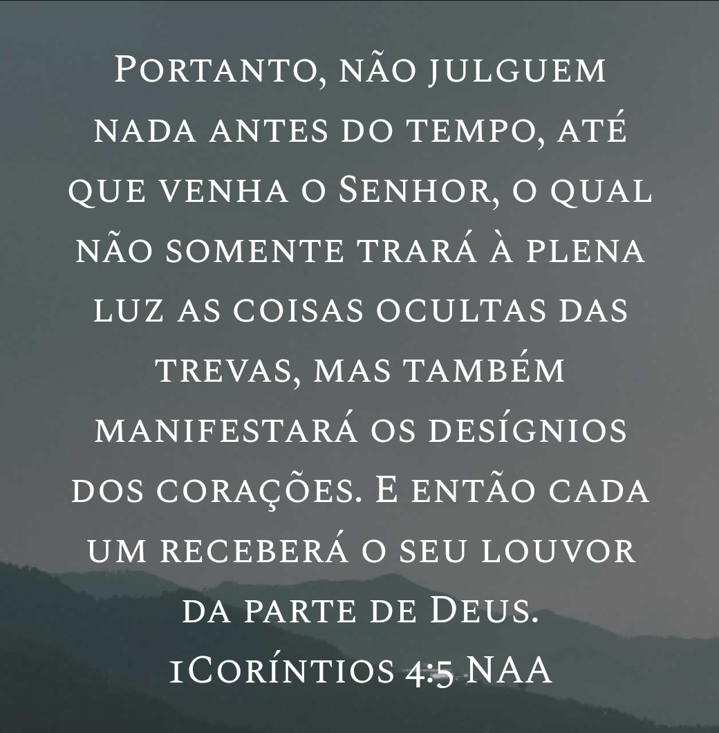 Portanto, não julguem nada antes do tempo, até que venha o Senhor, o qual não somente trará à plena luz as coisas ocultas das trevas, mas também manifestará os desígnios dos corações. E então cada um receberá o seu louvor da parte de Deus. 1Coríntios 4:5 NAA