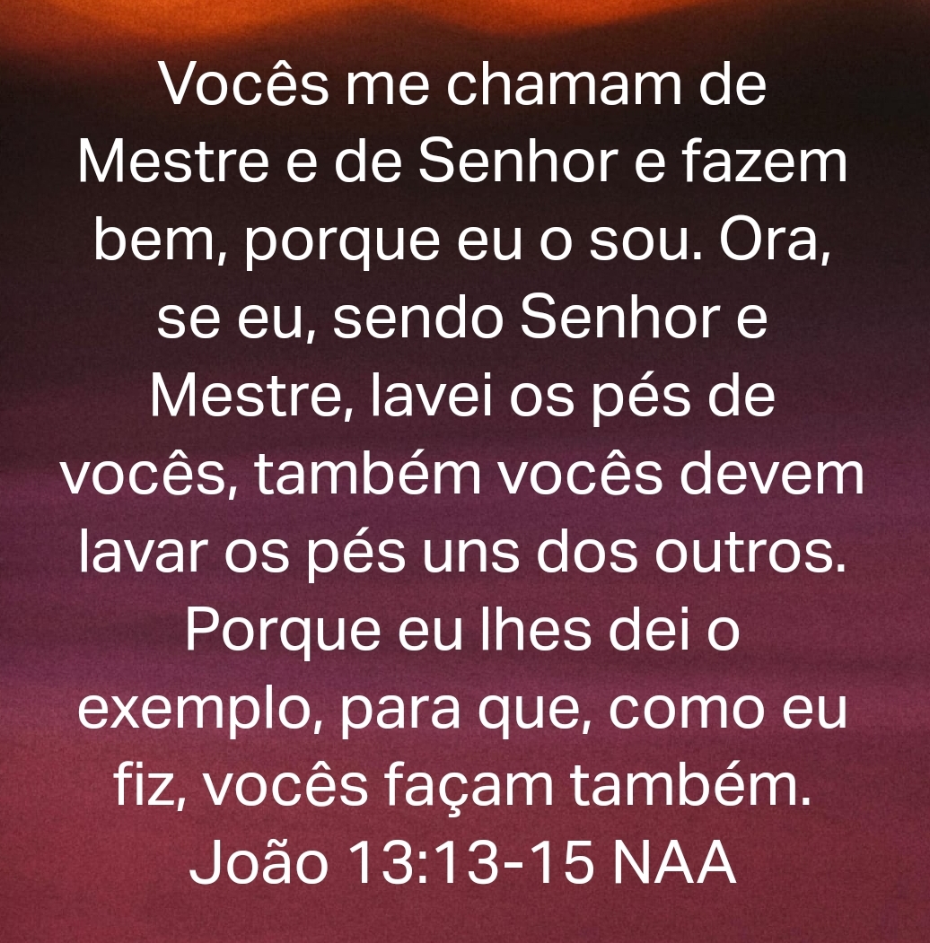 Vocês me chamam de Mestre e de Senhor e fazem bem, porque eu o sou. Ora, se eu, sendo Senhor e Mestre, lavei os pés de vocês, também vocês devem lavar os pés uns dos outros. Porque eu lhes dei o exemplo, para que, como eu fiz, vocês façam também. João 13:13-15 NAA