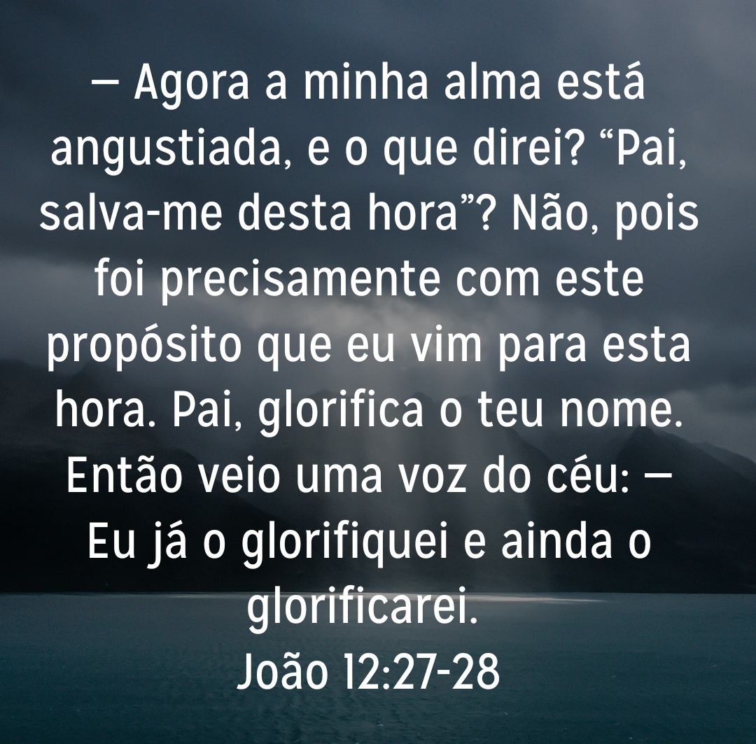 — Agora a minha alma está angustiada, e o que direi? “Pai, salva-me desta hora”? Não, pois foi precisamente com este propósito que eu vim para esta hora. Pai, glorifica o teu nome. Então veio uma voz do céu: — Eu já o glorifiquei e ainda o glorificarei.