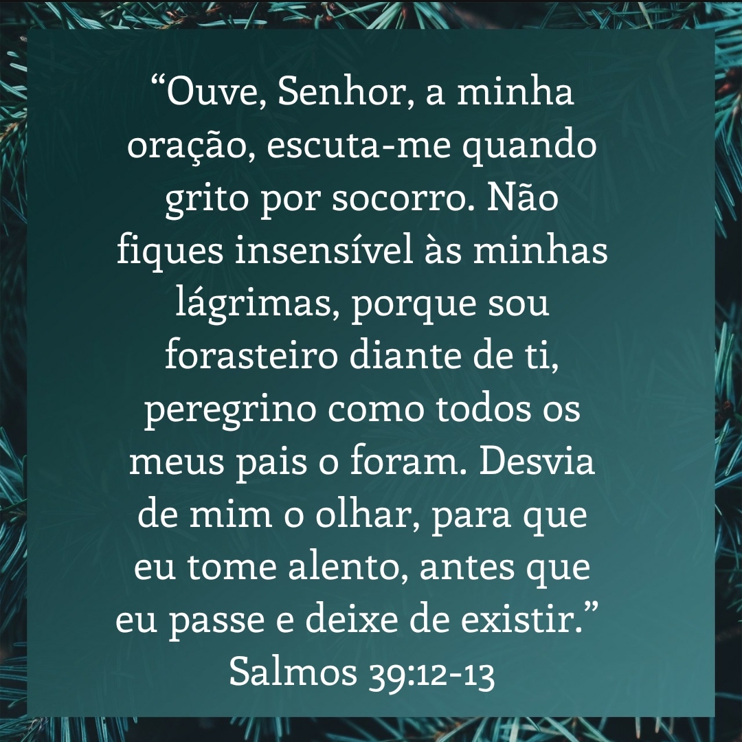 “Ouve, Senhor, a minha oração, escuta-me quando grito por socorro. Não fiques insensível às minhas lágrimas, porque sou forasteiro diante de ti, peregrino como todos os meus pais o foram. Desvia de mim o olhar, para que eu tome alento, antes que eu passe e deixe de existir.”