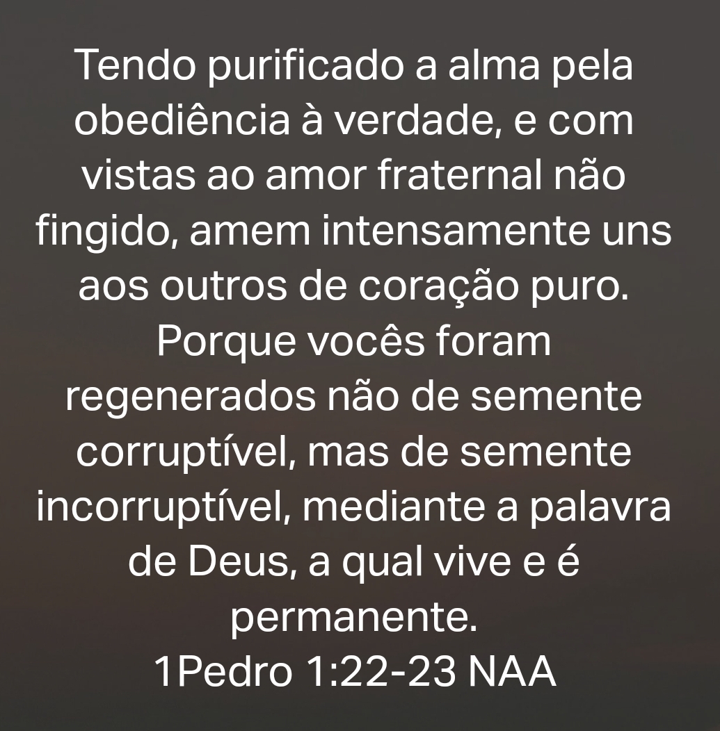 Tendo purificado a alma pela obediência à verdade, e com vistas ao amor fraternal não fingido, amem intensamente uns aos outros de coração puro. Porque vocês foram regenerados não de semente corruptível, mas de semente incorruptível, mediante a palavra de Deus, a qual vive e é permanente. 1Pedro 1:22-23 NAA