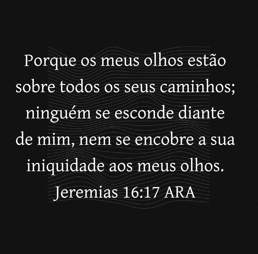 Porque os meus olhos estão sobre todos os seus caminhos; ninguém se esconde diante de mim, nem se encobre a sua iniquidade aos meus olhos. Jeremias 16:17 ARA