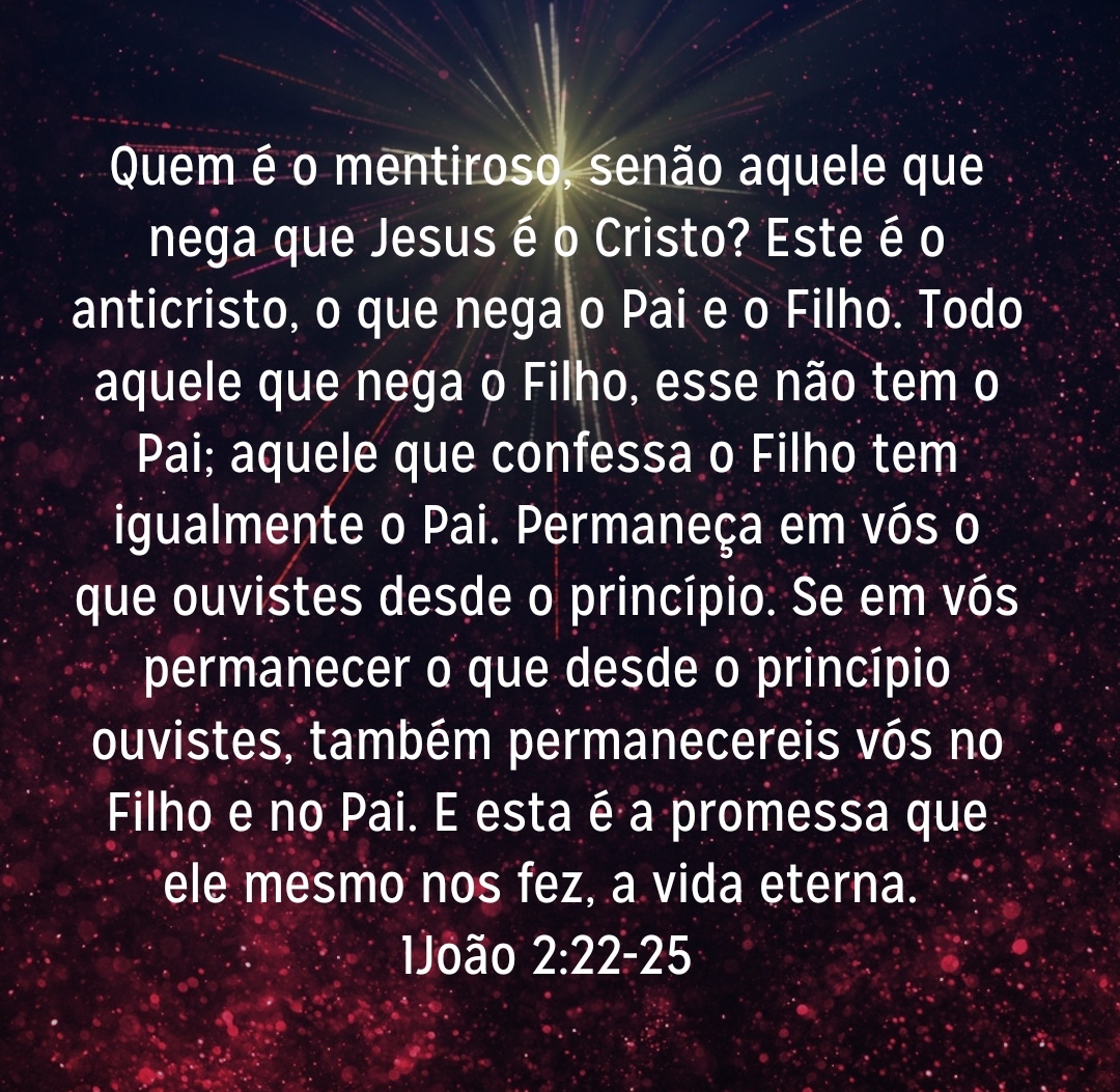 Quem é o mentiroso, senão aquele que nega que Jesus é o Cristo? Este é o anticristo, o que nega o Pai e o Filho. Todo aquele que nega o Filho, esse não tem o Pai; aquele que confessa o Filho tem igualmente o Pai. Permaneça em vós o que ouvistes desde o princípio. Se em vós permanecer o que desde o princípio ouvistes, também permanecereis vós no Filho e no Pai. E esta é a promessa que ele mesmo nos fez, a vida eterna.