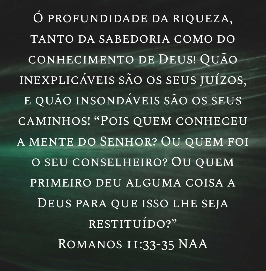 Ó profundidade da riqueza, tanto da sabedoria como do conhecimento de Deus! Quão inexplicáveis são os seus juízos, e quão insondáveis são os seus caminhos! “Pois quem conheceu a mente do Senhor? Ou quem foi o seu conselheiro? Ou quem primeiro deu alguma coisa a Deus para que isso lhe seja restituído?” Romanos 11:33-35 NAA
